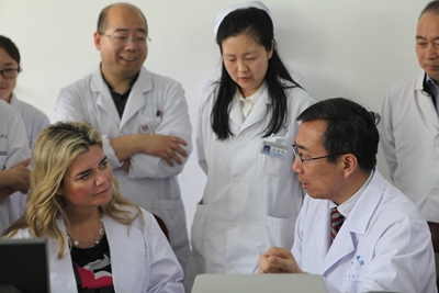 揭牌仪式后,黄俊星陪同Christine Brezden-Masle教授和ying ya wu医生一起,走进肿瘤科、乳腺外科,分别对恶性肿瘤的疑难病例治疗、手术方案以及术后的继续治疗展开讨论和交流。令加拿大客人颇感意外的是,黄俊星和医技科室专家在病例讨论过程中,均用流利的英语与之交流,充分展示了我院医疗专家的专业能力和职业素养。